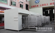 (8)烘干箱內(nèi)可存放1輛推車。推車配置耐高溫角輪(定向輪、萬向輪各2個),推車?yán)锩姘惭b限位柱用于定位里面托盤,兩側(cè)配有L形托架,用于支撐及左右限位托盤。進(jìn)出口裝有手動爐門。頂部部置循環(huán)風(fēng)機(jī)、蒸氣換熱器等裝置,排廢風(fēng)機(jī)安裝在爐體頂部。